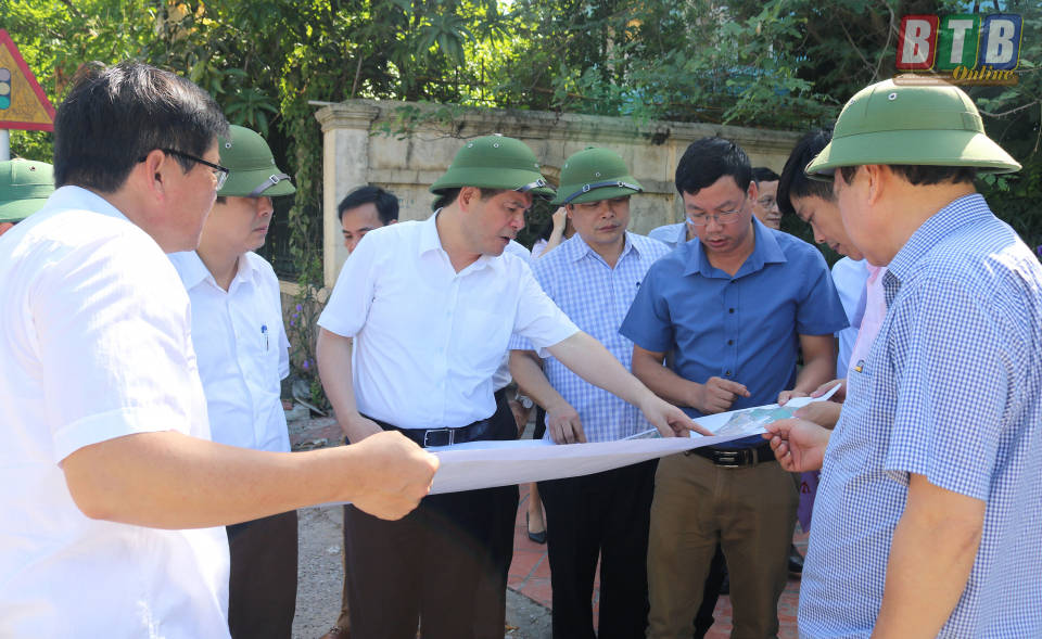 Các đồng chí lãnh đạo tỉnh kiểm tra đoạn đầu dự án đường 221A thuộc xã Tây Sơn (Tiền Hải).