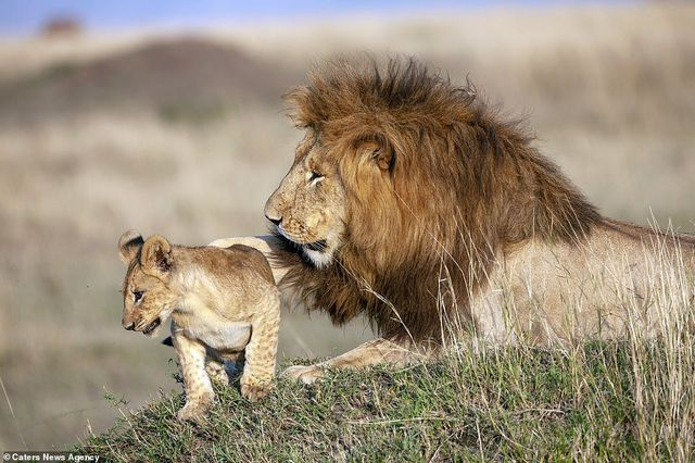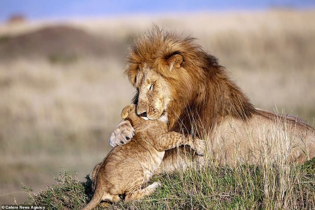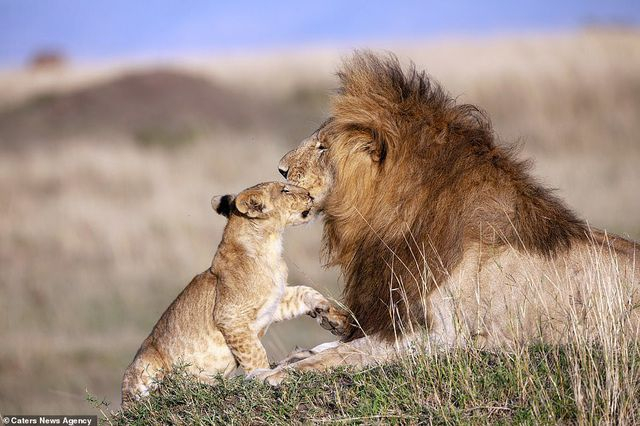 Hai cha con sư tử đã có những giây phút gần gũi ấm áp gợi nhắc tới chuyện phim "Vua sư tử", cảnh tượng được chụp lại tại vườn quốc gia Masai Mara ở Kenya.