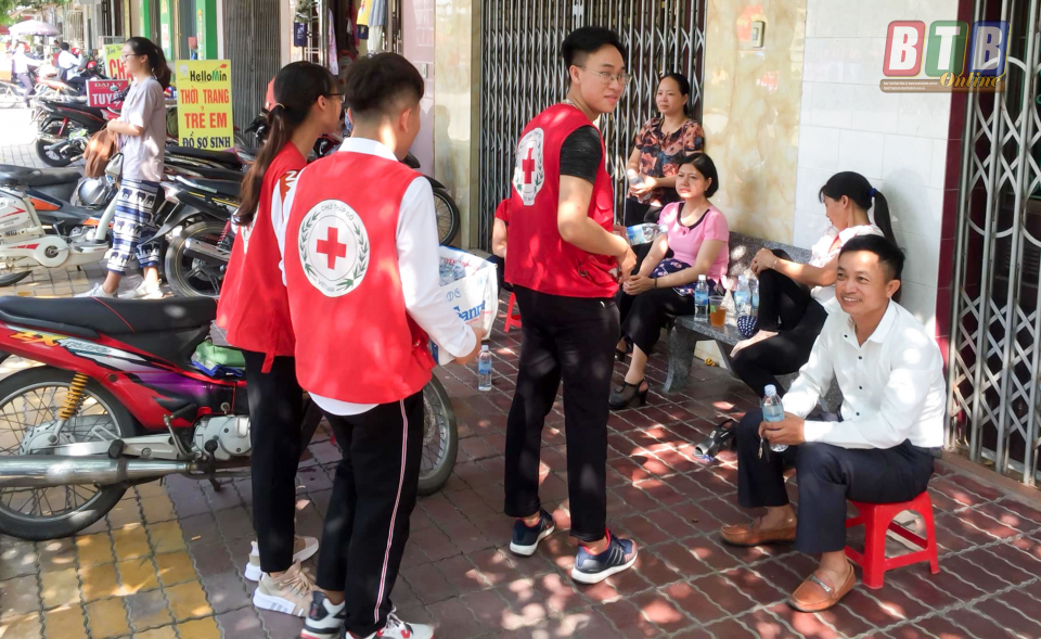 Tình nguyện viên Hội Chữ thập đỏ huyện Vũ Thư phát nước miễn phí cho các thí sinh.