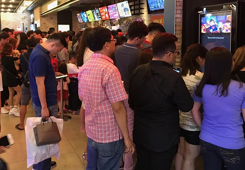 Khán giả xếp hàng mua vé, lấy vé online ở một rạp tại TP HCM ngày Tết.