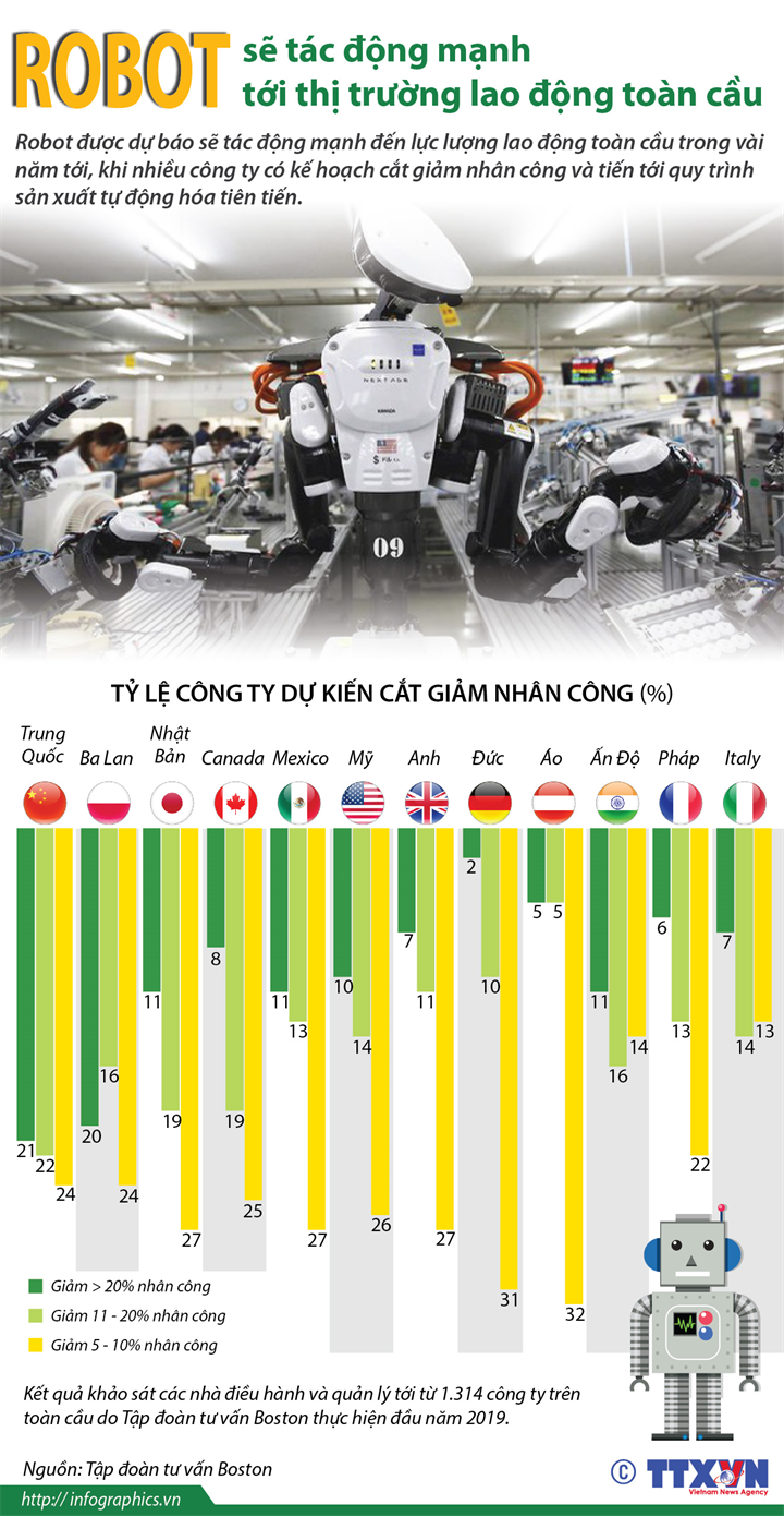 Robot được dự báo sẽ tác động mạnh đến lực lượng lao động toàn cầu trong vài năm tới, khi nhiều công ty có kế hoạch cắt giảm nhân công và tiến tới quy trình sản xuất tự động hóa tiên tiến.