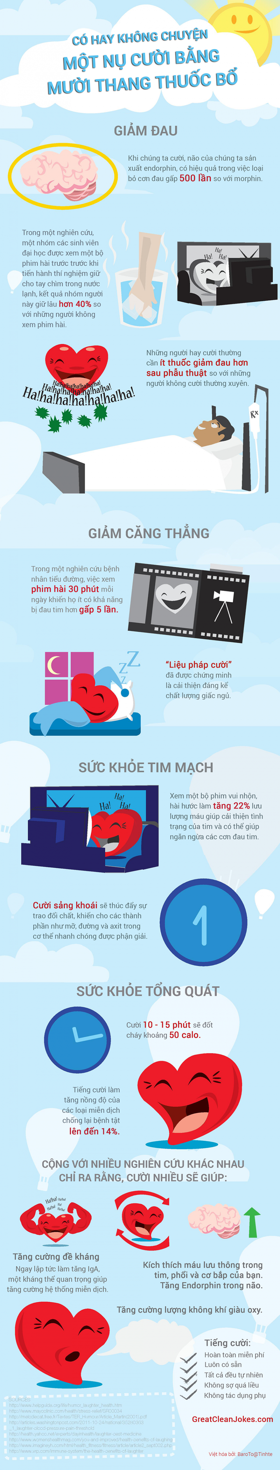 Bạn có cười nhiều không? Bạn nên hài hước đi bởi vì cười thực sự có thể cải thiện sức khỏe của bạn. Nó cũng chứng minh rằng tiếng cười giúp giảm căng thẳng và cải thiện chất lượng giấc ngủ tốt hơn. Và cũng mang lại một trái tim khỏe mạnh! Điều tuyệt vời hơn là tiếng cười hoàn toàn miễn phí.