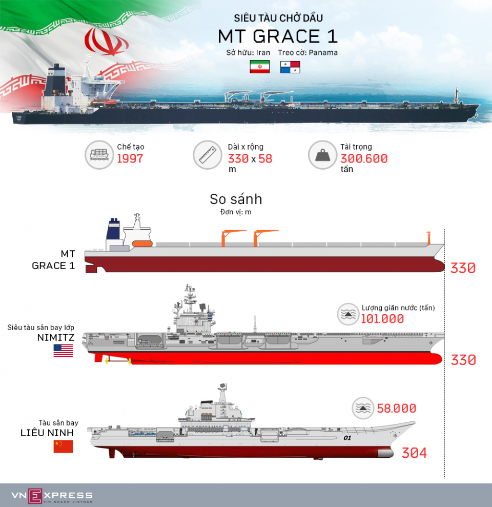 Kích thước bằng tàu sân bay Mỹ và khả năng chở được hơn 300.000 tấn dầu thô khiến MT Grace 1 được gọi là 'siêu tàu' của Iran.