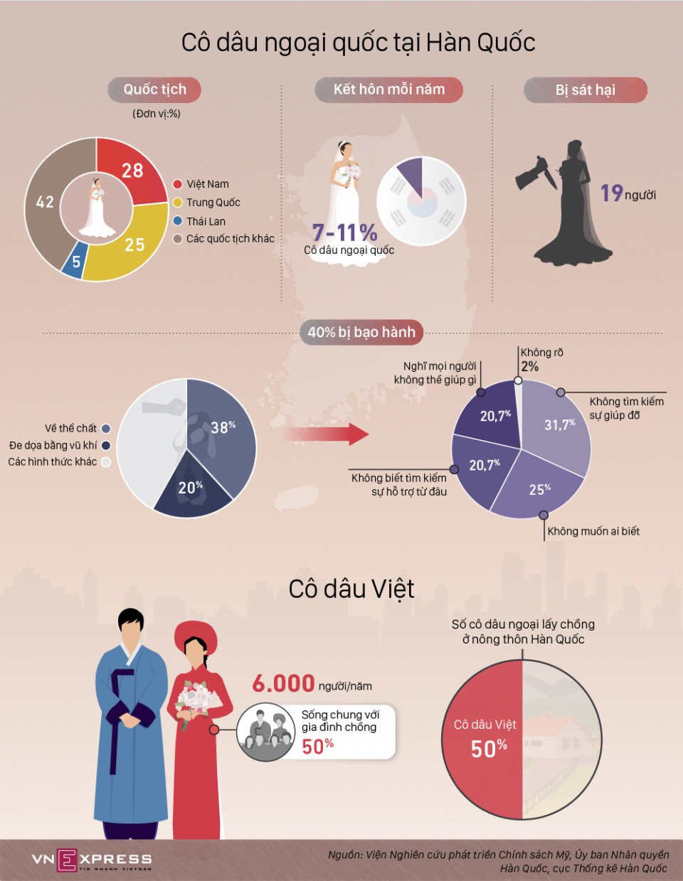 Mỗi năm có 7-11% trường hợp đàn ông Hàn Quốc kết hôn với phụ nữ ngoại quốc và gần một nửa trong số này bị chồng bạo hành bằng nhiều cách thức khác nhau.