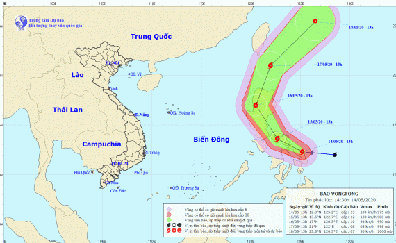 Dự báo trong 24 giờ tới, bão di chuyển theo hướng Tây Tây Bắc, mỗi giờ đi được 10-15km. Đến 13 giờ ngày 15/5, vị trí tâm bão ở khoảng 13,6 độ Vĩ Bắc; 122,7 độ Kinh Đông, trên khu vực miền Trung Phi-líp-pin. Sức gió mạnh nhất vùng gần tâm bão mạnh cấp 12 (115-135km/giờ), giật cấp 14.