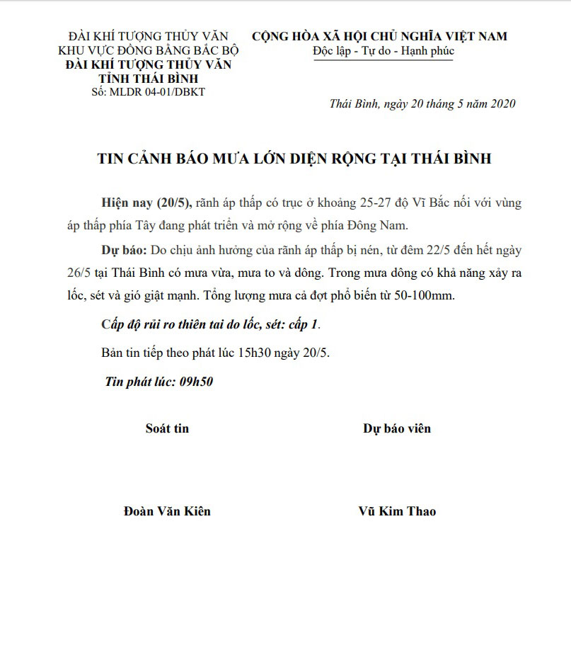 Ngày 20/5, Đài Khí tượng thủy văn tỉnh Thái Bình đưa ra cảnh báo mưa lớn diện rộng tại Thái Bình.