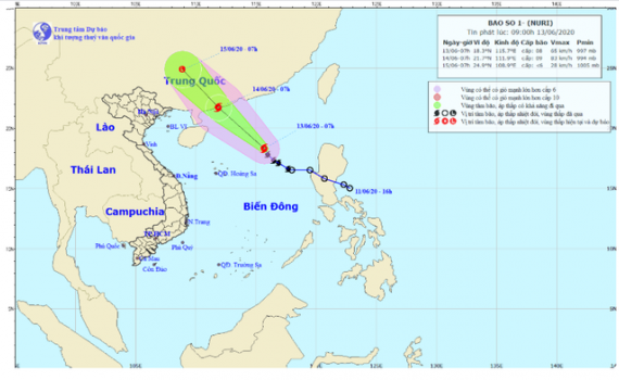 Dự báo trong 12 giờ tới, bão di chuyển theo hướng Tây Bắc, mỗi giờ đi được 20-25 km và có khả năng mạnh thêm. Đến 22h ngày 13/6, vị trí tâm bão ở khoảng 20,5 độ Vĩ Bắc; 113,1 độ Kinh Đông, cách đất liền tỉnh Quảng Đông (Trung Quốc) khoảng 200km về phía Đông Nam. Sức gió mạnh nhất vùng gần tâm bão mạnh cấp 9 (75-90km/giờ), giật cấp 12.
