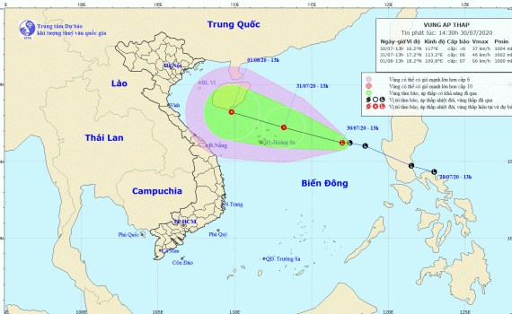 Dự báo trong 24 giờ tới, vùng áp thấp di chuyển theo hướng Tây Tây Bắc, mỗi giờ đi được 15-20km và có khả năng mạnh lên thành áp thấp nhiệt đới. Đến 13 giờ ngày 31/7, vị trí tâm áp thấp nhiệt đới ở khoảng 17,2 độ Vĩ Bắc; 113,2 độ Kinh Đông, cách quần đảo Hoàng Sa khoảng 100km về phía Đông Đông Bắc. Sức gió mạnh nhất vùng gần tâm áp thấp nhiệt đới mạnh cấp 6 (40-50km/giờ), giật cấp 8.