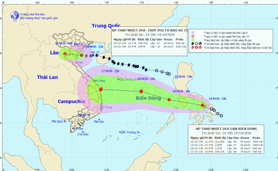 Dự báo trong 12 giờ tới, áp thấp nhiệt đới di chuyển theo hướng Tây, mỗi giờ đi được 10-15km, đi vào đất liền các tỉnh từ Thái Bình đến Nghệ An, sau đó suy yếu thành một vùng áp thấp. Đến 01 giờ ngày 15/10, vị trí trung tâm vùng áp thấp ở khoảng 19,9 độ Vĩ Bắc; 104,0 độ Kinh Đông, trên khu vực thượng Lào. Sức gió mạnh nhất ở trung tâm vùng áp thấp giảm xuống dưới cấp 6 (dưới 40km/giờ).
