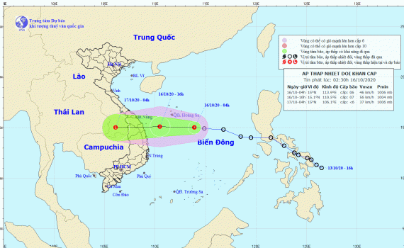 Dự báo trong 12 giờ tới, áp thấp nhiệt đới di chuyển theo hướng Tây Tây Bắc, mỗi giờ đi được khoảng 25-30km và có khả năng mạnh thêm. Đến 16 giờ ngày 16/10, vị trí tâm áp thấp nhiệt đới ở khoảng 15,1 độ Vĩ Bắc; 110,5 độ Kinh Đông, cách đất liền các tỉnh Đà Nẵng-Khánh Hòa khoảng 160km về phía Đông. Sức gió mạnh nhất vùng gần tâm áp thấp nhiệt đới mạnh cấp 6-7 (40-60km/giờ), giật cấp 9.