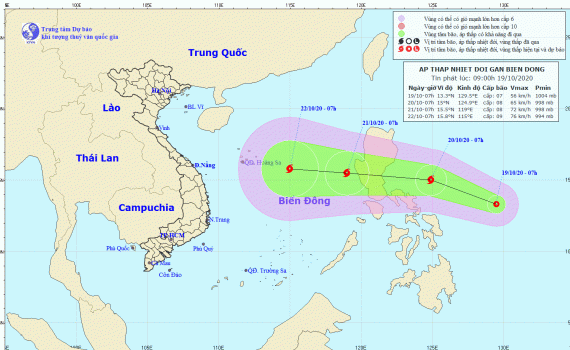 Dự báo trong 24 giờ tới, áp thấp nhiệt đới di chuyển theo hướng Tây Tây Bắc, mỗi giờ đi được khoảng 20km và có khả năng mạnh lên thành bão. Đến 07 giờ ngày 20/10, vị trí tâm bão ở khoảng 15,0 độ Vĩ Bắc; 124,9 độ Kinh Đông, cách đảo Lu-dông (Phi-líp-pin) khoảng 350km về phía Đông Đông Nam. Sức gió mạnh nhất vùng gần tâm bão mạnh cấp 8 (60-75km/giờ), giật cấp 10.
