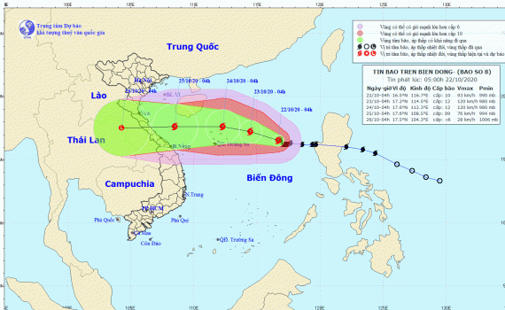 Dự báo trong 24 giờ tới, bão di chuyển theo hướng Tây Tây Bắc, mỗi giờ đi được khoảng 10km và có khả năng mạnh thêm. Đến 04 giờ ngày 23/10, vị trí tâm bão ở khoảng 17,2 độ Vĩ Bắc; 114,5 độ Kinh Đông, cách quần đảo Hoàng Sa khoảng 220km về phía Đông Đông Bắc. Sức gió mạnh nhất vùng gần tâm bão mạnh cấp 11-12 (100-135km/giờ), giật cấp 14.