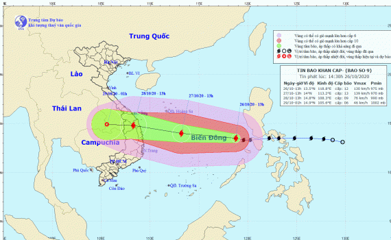 Dự báo trong 24 giờ tới, bão di chuyển theo hướng Tây Tây Bắc, mỗi giờ đi được 20-25km và tiếp tục mạnh thêm. Đến 13 giờ ngày 27/10, vị trí tâm bão ở khoảng 14,0 độ Vĩ Bắc; 113,2 độ Kinh Đông, cách bờ biển từ Đà Nẵng đến Phú Yên khoảng 460km về phía Đông. Sức gió mạnh nhất vùng gần tâm bão mạnh cấp 12-13 (115-150km/giờ), giật cấp 15.