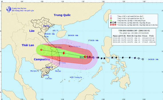 Dự báo trong 24 giờ tới, bão di chuyển theo hướng Tây Tây Bắc, mỗi giờ đi được 20-25km và có khả năng mạnh thêm. Đến 04 giờ ngày 28/10, vị trí tâm bão ở khoảng 14,6 độ Vĩ Bắc; 110,3 độ Kinh Đông trên vùng biển các tỉnh từ Đà Nẵng đến Phú Yên. Sức gió mạnh nhất vùng gần tâm bão mạnh cấp 13-14 (135-165km/giờ), giật cấp 17.