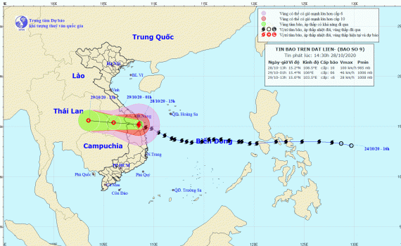 Hồi 13 giờ (28/10), vị trí tâm bão ở khoảng 15,2 độ Vĩ Bắc; 108,5 độ Kinh Đông, trên đất liền Quảng Nam, Quảng Ngãi. Sức gió mạnh nhất vùng gần tâm bão mạnh cấp 10 (90-100km/giờ), giật cấp 12. Bán kính gió mạnh từ cấp 6, giật từ cấp 8 trở lên khoảng 150km tính từ tâm bão; bán kính gió mạnh từ cấp 10, giật từ cấp 12 trở lên khoảng 50km tính từ tâm bão.