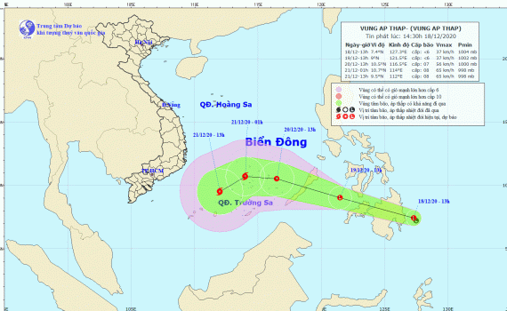 Trong 24 đến 48 giờ tiếp theo, vùng áp thấp di chuyển theo hướng Tây Tây Bắc, mỗi giờ đi được 20-25km đi vào Biển Đông và có khả năng mạnh lên thành áp thấp nhiệt đới. Đến 13 giờ ngày 20/12, vị trí tâm áp thấp nhiệt đới ở khoảng 10,5 độ Vĩ Bắc; 116,5 độ Kinh Đông, cách đảo Song Tử Tây (quần đảo Trường Sa) khoảng 250km về phía Đông Đông Nam. Sức gió mạnh nhất vùng gần tâm áp thấp nhiệt đới mạnh cấp 6-7 (40-60km/giờ), giật cấp 9.