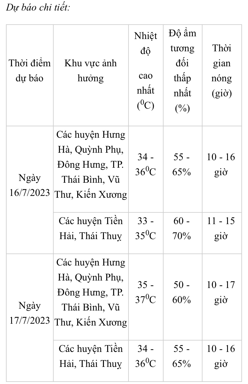 Ngày mai (16/7) và ngày 17/7, trên địa bàn tỉnh tiếp tục xảy ra nắng nóng với nhiệt độ cao nhất phổ biến: 34 - 36 độ C. Độ ẩm tương đối thấp nhất phổ biến 55 - 65%.