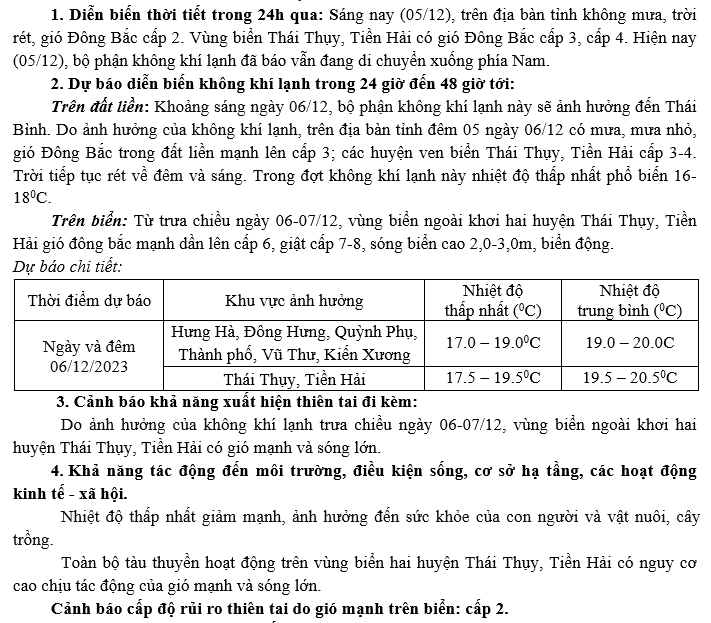 Tin không khí lạnh tăng cường khu vực tỉnh Thái Bình