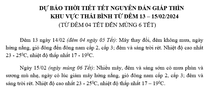 - Dự báo thời tiết tết Nguyên đán Giáp Thìn khu vực Thái Bình 09.02.2024 | 13:49 PM