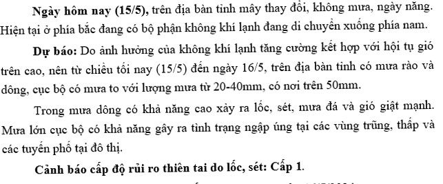 - Tin cảnh báo dông, lốc, sét, mưa đá và mưa lớn cục bộ tại Thái Bình 19.09.2024 | 14:02 PM