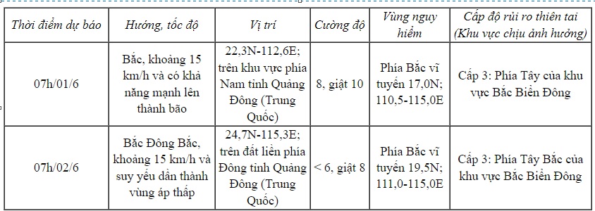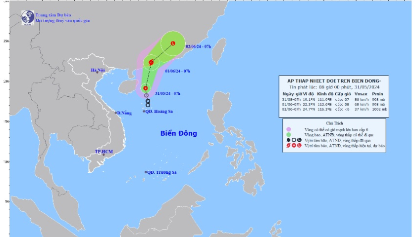 Hồi 07 giờ ngày 31/5, vị trí tâm áp thấp nhiệt đới ở vào khoảng 19,1 độ Vĩ Bắc; 111,9 độ Kinh Đông, trên khu vực phía Bắc quần đảo Hoàng Sa, cách đảo Hải Nam (Trung Quốc) khoảng 160km về phía Đông. Sức gió mạnh nhất vùng gần tâm áp thấp nhiệt đới mạnh cấp 7 (50-61km/h), giật cấp 9; di chuyển theo hướng Bắc với tốc độ khoảng 10km/h.