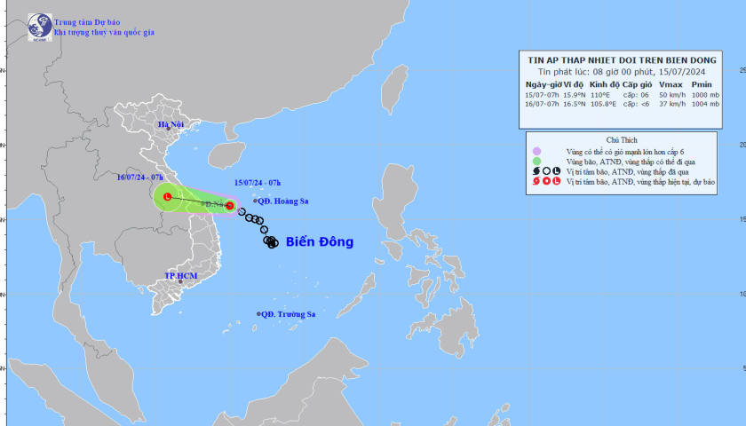 Hồi 07 giờ ngày 15/7, vị trí tâm áp thấp nhiệt đới ở vào khoảng 15,9 độ Vĩ Bắc; 110,0 độ Kinh Đông, trên vùng biển phía Tây Tây Nam của quần đảo Hoàng Sa. Sức gió mạnh nhất vùng gần tâm áp thấp nhiệt đới mạnh cấp 6 (39-49km/h), giật cấp 8; di chuyển theo hướng Tây Tây Bắc với tốc độ khoảng 10km/h.