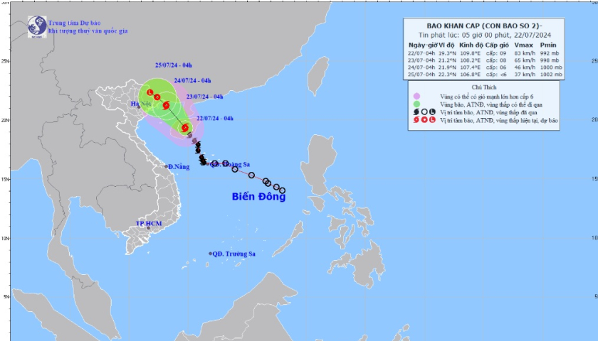 Hồi 04 giờ ngày 22/7, vị trí tâm bão ở vào khoảng 19,3 độ Vĩ Bắc; 109,8 độ Kinh Đông, trên khu vực đảo Hải Nam (Trung Quốc). Sức gió mạnh nhất vùng gần tâm bão mạnh cấp 9 (75-88km/h), giật cấp 11, di chuyển theo hướng Tây Bắc với tốc độ khoảng 15km/h