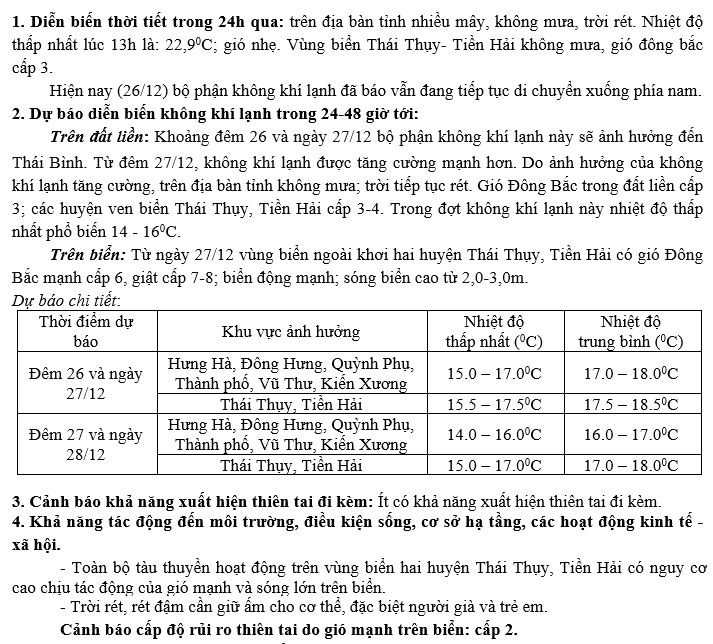 Tin không khí lạnh tăng cường và rét tỉnh Thái Bình