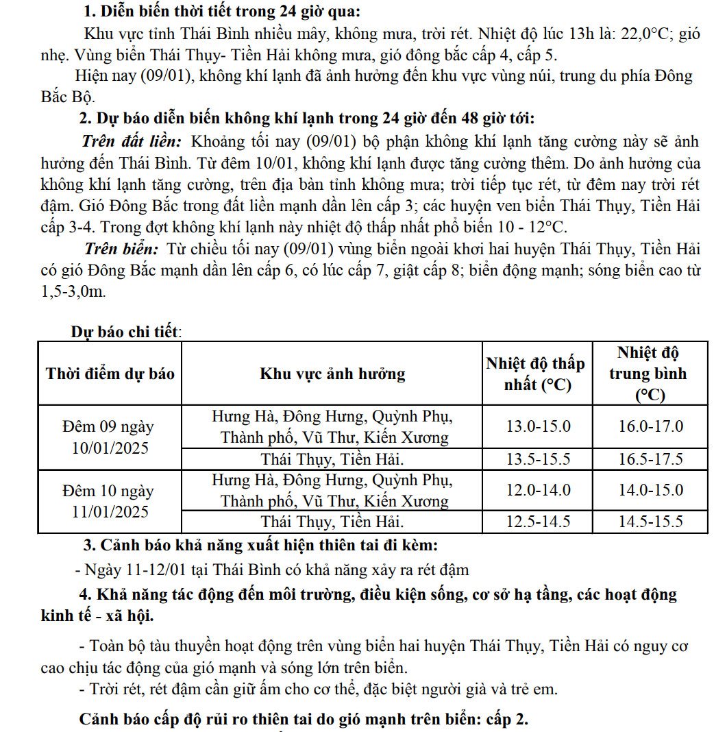 Tin không khí lạnh tăng cường tỉnh Thái Bình