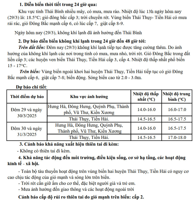 Tin gió mùa Đông Bắc tỉnh Thái Bình