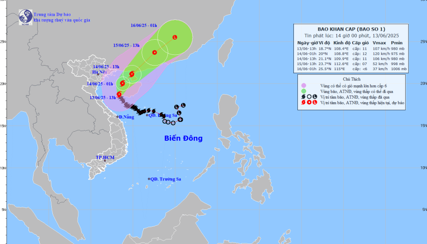 Đến 01h ngày 14/6, vị trí tâm bão ở vào khoảng 20,0N-108,8E; trên khu vực phía Đông của Bắc vịnh Bắc Bộ. Cường độ cấp 11-12, giật cấp 14.