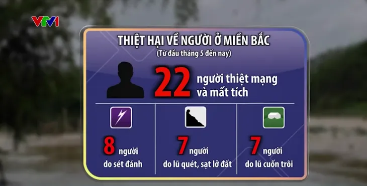 Theo thống kê, đã có 22 người thiệt mạng và mất tích, trong đó: 8 người chết do sét đánh, 7 người do lũ quét và sạt lở đất, 7 người bị lũ cuốn trôi.