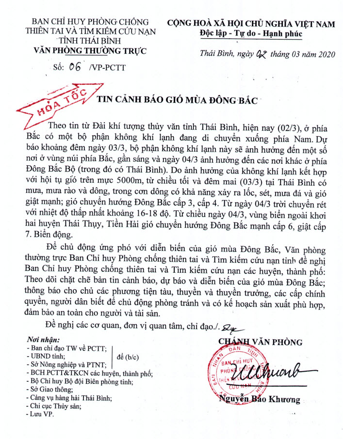 Ngày 02/03/2020, Văn phòng thường trực Ban Chỉ huy phòng chống thiên tai và tìm kiếm cứu nạn tỉnh Thái Bình ra Công văn số 06/VP-PCTT cảnh báo gió mùa Đông Bắc.