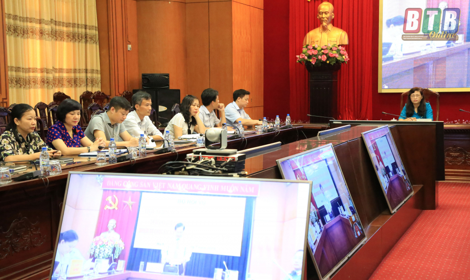 Đồng chí Nguyễn Thị Lĩnh, Tỉnh ủy viên, Phó Chủ tịch UBND tỉnh dự hội nghị tại điểm cầu Thái Bình. Ảnh: Thành Tâm