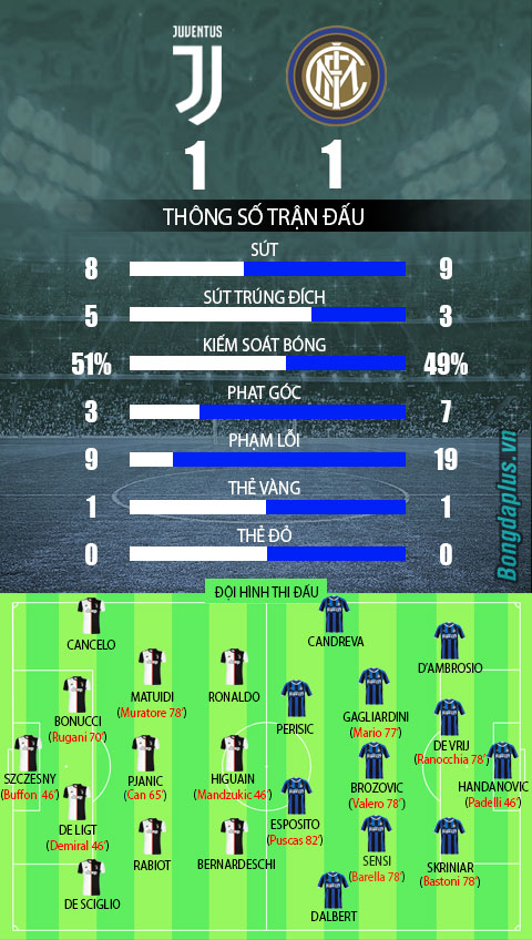 Sau rất nhiều nỗ lực không biết mệt mỏi, Juve cuối cùng cũng được đền đáp với bàn gỡ hòa. Phút 68, Ronaldo sút phạt đập trúng hàng rào Inter đổi hướng đi vào lưới, mang về bàn gỡ cho Juve. Một pha lập công có phần may mắn của CR7.
