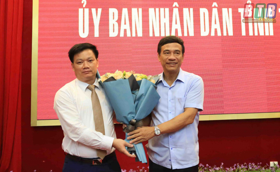 Đồng chí Đặng Trọng Thăng, Phó Bí thư Tỉnh ủy, Chủ tịch UBND tỉnh tặng hoa chúc mừng đồng chí Nguyễn Khắc Thận, Tỉnh ủy viên, Phó Chủ tịch UBND tỉnh.