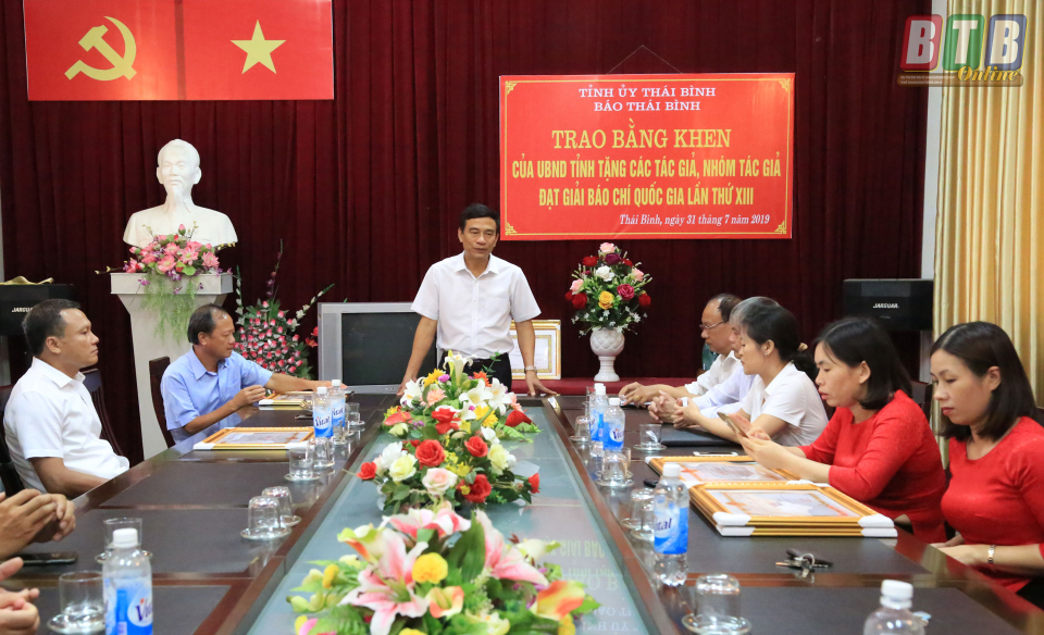 Trao Bằng khen của UBND tỉnh cho 10 tác giả đạt Giải Báo chí quốc gia năm 2018, phát biểu với tập thể cán bộ, phóng viên, biên tập viên Báo Thái Bình, đồng chí Đặng Trọng Thăng, Phó Bí thư Tỉnh ủy, Chủ tịch UBND tỉnh chúc mừng các tác giả đạt giải và bày tỏ sự phấn khởi với những giải thưởng mà Báo Thái Bình đạt được.
