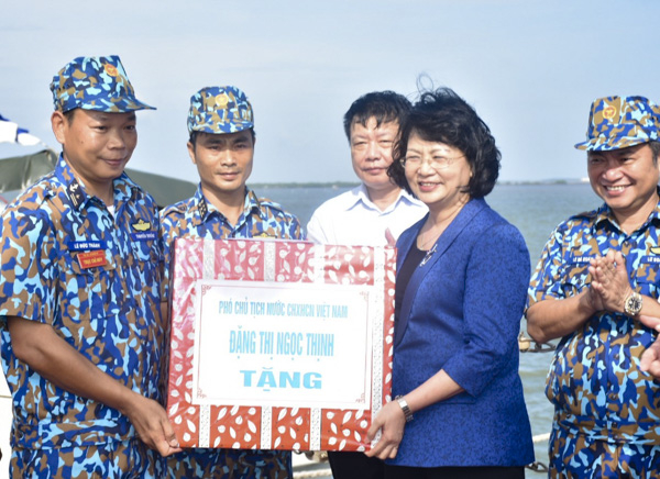 Phó Chủ tịch nước Đặng Thị Ngọc Thịnh trao quà cho các chiến sĩ tàu 383. (Ảnh: Thành Huy)
