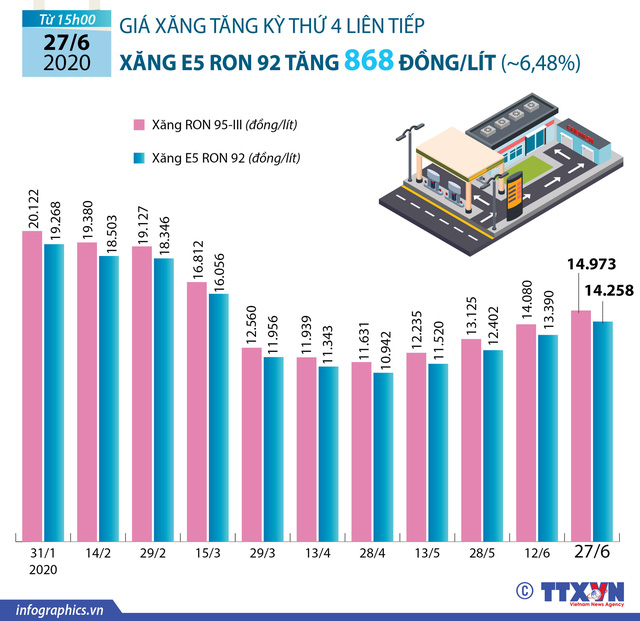 Từ 15h00 chiều 27/6, giá xăng dầu trong nước đã được điều chỉnh tăng, trong đó, giá xăng E5RON92 tăng 868 đồng/lít; xăng RON95-III tăng 893 đồng/lít. Điều này đồng nghĩa việc giá xăng trong nước đã có lần tăng thứ 4 liên tiếp.