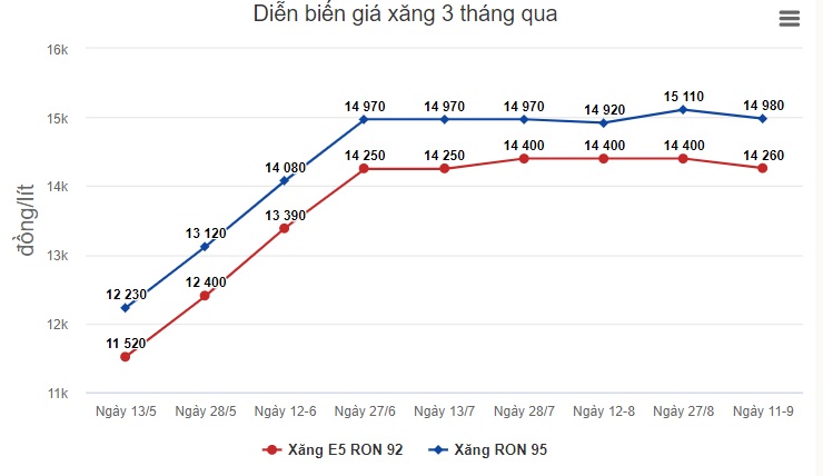 Theo thông báo điều chỉnh giá bán lẻ xăng dầu của liên Bộ Công Thương - Tài chính, mỗi lít xăng E5 RON 92 giảm 143 đồng, xăng RON 95 hạ 130 đồng. Các mặt hàng dầu giảm nhiều hơn, như dầu hoả giảm 532 đồng mỗi lít; dầu diesel hạ 443 đồng và madut cũng thấp hơn 240 đồng một kg so với kỳ điều hành cuối tháng 8.