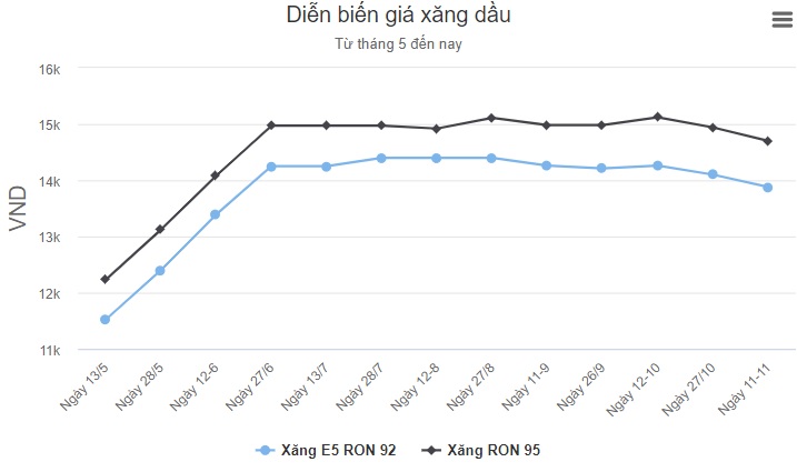 Liên Bộ Công Thương - Tài chính cho biết, với việc điều chỉnh này, giá xăng E5RON92 lên tối đa 14.494 đồng còn xăng RON95 giá cao nhất là 15.351 đồng. Giá dầu diesel tăng 596 đồng, lên 11.434 đồng một lít. Dầu hoả tăng 576 đồng một lít, thành 10.138 đồng. Dầu madut tối đa 11.742 đồng một kg, tương đương mức tăng 651 đồng.