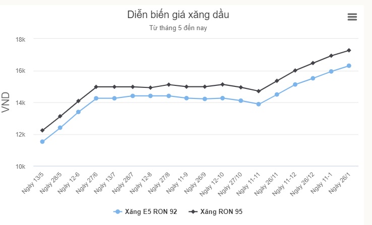 Liên Bộ Công Thương - Tài chính cho biết, với việc điều chỉnh này, giá xăng E5 RON 92 tăng 361 đồng lên tối đa 16.309 đồng một lít. RON 95 tăng 340 đồng, giá cao nhất là 17.270 đồng. Dầu diesel là 13.042 đồng (tăng 395 đồng). Dầu hoả là 11.908 đồng (tăng 350 đồng). Dầu madut tăng 350 đồng, tối đa 12.622 đồng một kg.