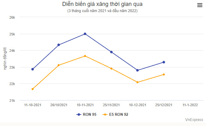 Theo điều hành giá bán lẻ của liên Bộ Công Thương - Tài chính, giá xăng E5 RON 92 từ 15h ngày 11/1 sau điều chỉnh là 23.150 đồng một lít (tăng 600 đồng); RON 95 là 23.870 đồng một lít (tăng 580 đồng).