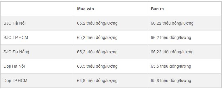 Doji Hà Nội: 65,0 triệu đồng/lượng (mua vào) - 66,2 triệu đồng/lượng (bán ra)