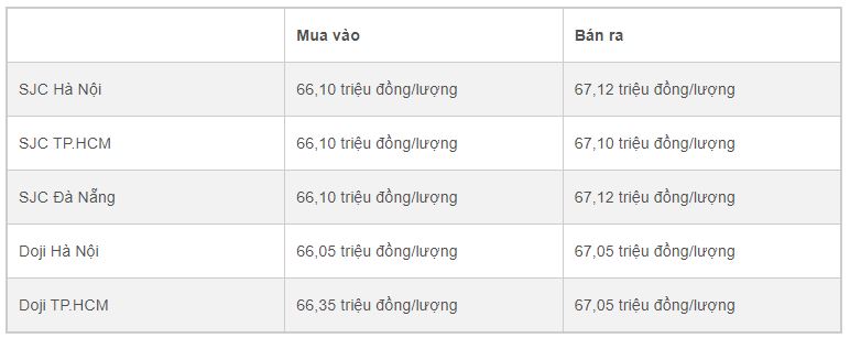 Doji Hà Nội niêm yết ở mức 66,1 triệu đồng/lượng (mua vào) và 67,1 triệu đồng/lượng (bán ra). Tại TP.HCM, Doji TP.HCM mua vàng SJC ở mức 66,3 triệu đồng/lượng, bán ra ở mức 67 triệu đồng/lượng.