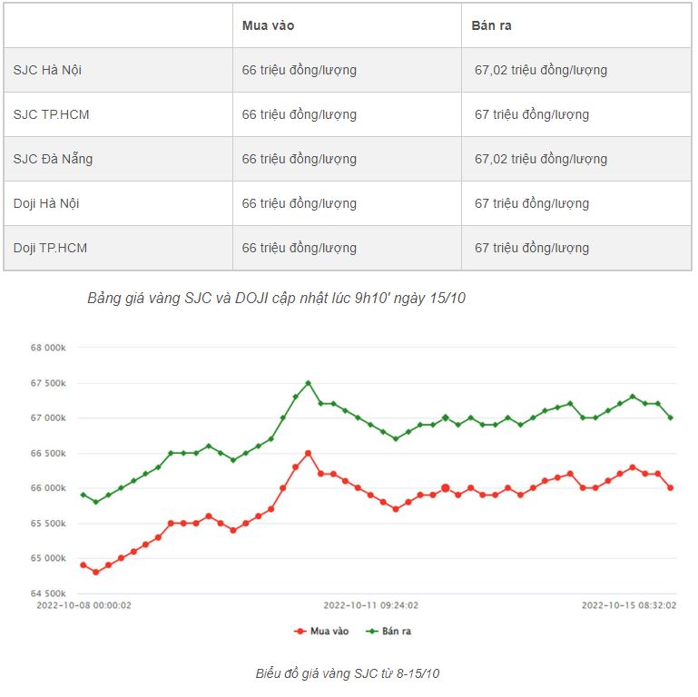 Kết thúc phiên 14/10, giá vàng miếng 9999 tại SJC TP.HCM là 66,2 triệu đồng/lượng (mua vào) - 67,2 triệu đồng/lượng (bán ra). SJC Hà Nội niêm yết ở mức 66,2 triệu đồng/lượng (mua vào) và 67,22 triệu đồng/lượng (bán ra).