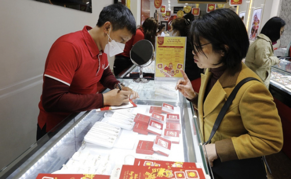 Hôm qua - ngày vía Thần Tài (mùng 10 tháng Giêng), người dân tập trung mua vàng nhẫn, vàng miếng 1 - 2 chỉ có hình con mèo, hình Thần Tài, vàng trang sức… nên vàng miếng SJC bị "chê". Do đó, vào cuối ngày hôm qua, giá vàng SJC giảm 100.000 - 250.000 đồng/lượng.