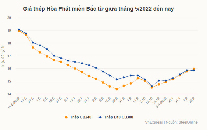 Theo số liệu của Steel Online - đại lý toàn quốc của nhiều thương hiệu lớn như Hòa Phát, Việt Ý, Kyoie, Pomina - giá thép Hòa Phát đang ở mức 15,96 triệu đồng một tấn đối với thép cuộn CB240 và 15,84 triệu đồng một tấn với thép D10 CB300. Các thương hiệu như thép Việt Ý, Việt Đức, Thép Miền Nam, Việt Nhật cũng bán quanh 16 triệu đồng một tấn. Riêng Pomina từ giữa tháng 2 đã nâng giá bán loại CB240 lên 17,57 triệu đồng một tấn và D10 CB300 lên 17,6 triệu đồng một tấn.
