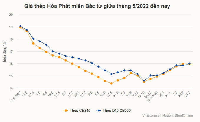 Giá thép tăng trái chiều nhu cầu tiêu thụ. Thống kê của Hiệp hội Thép Việt Nam (VSA) cho thấy, hai tháng đầu năm, bán hàng thép thành phẩm đạt hơn 3,8 triệu tấn, giảm hơn 23% so với cùng kỳ năm 2022. Riêng xuất khẩu đạt 1 triệu tấn, giảm 10%. Trong khi sản xuất thép thành phẩm đã giảm 16%, chênh lệch giữa tiêu thụ và sản xuất vẫn lên đến hơn 430.000 tấn.