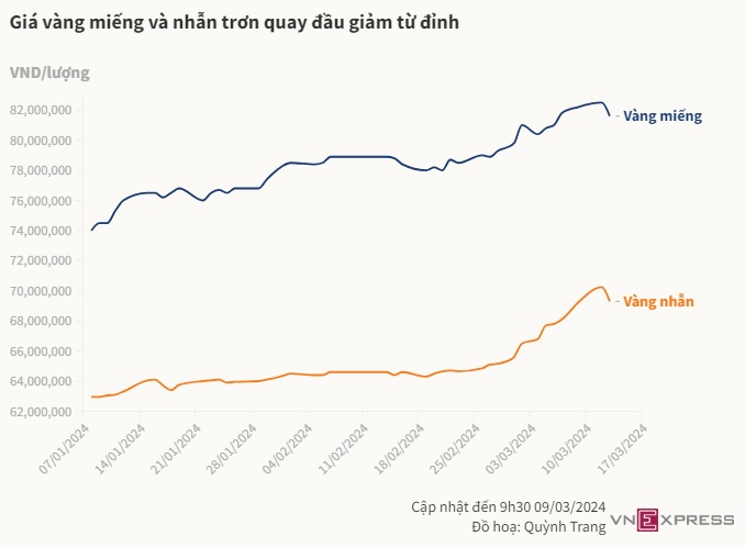 Sáng 13/3, các nhà vàng nhiều lần điều chỉnh giá vàng miếng và nhẫn trơn sau khi thị trường thế giới đảo chiều giảm.